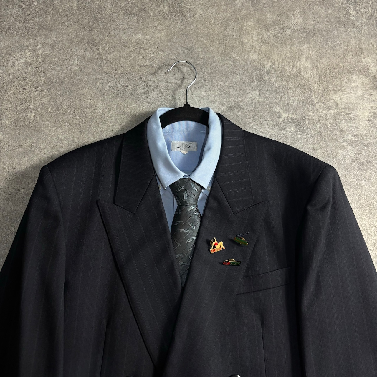 成人式/卒業式/入学式/結婚式の方に向けて拵えたスーツ/シャツ/ネクタイ/ヴィンテージピンズ4点フルセットでございます。