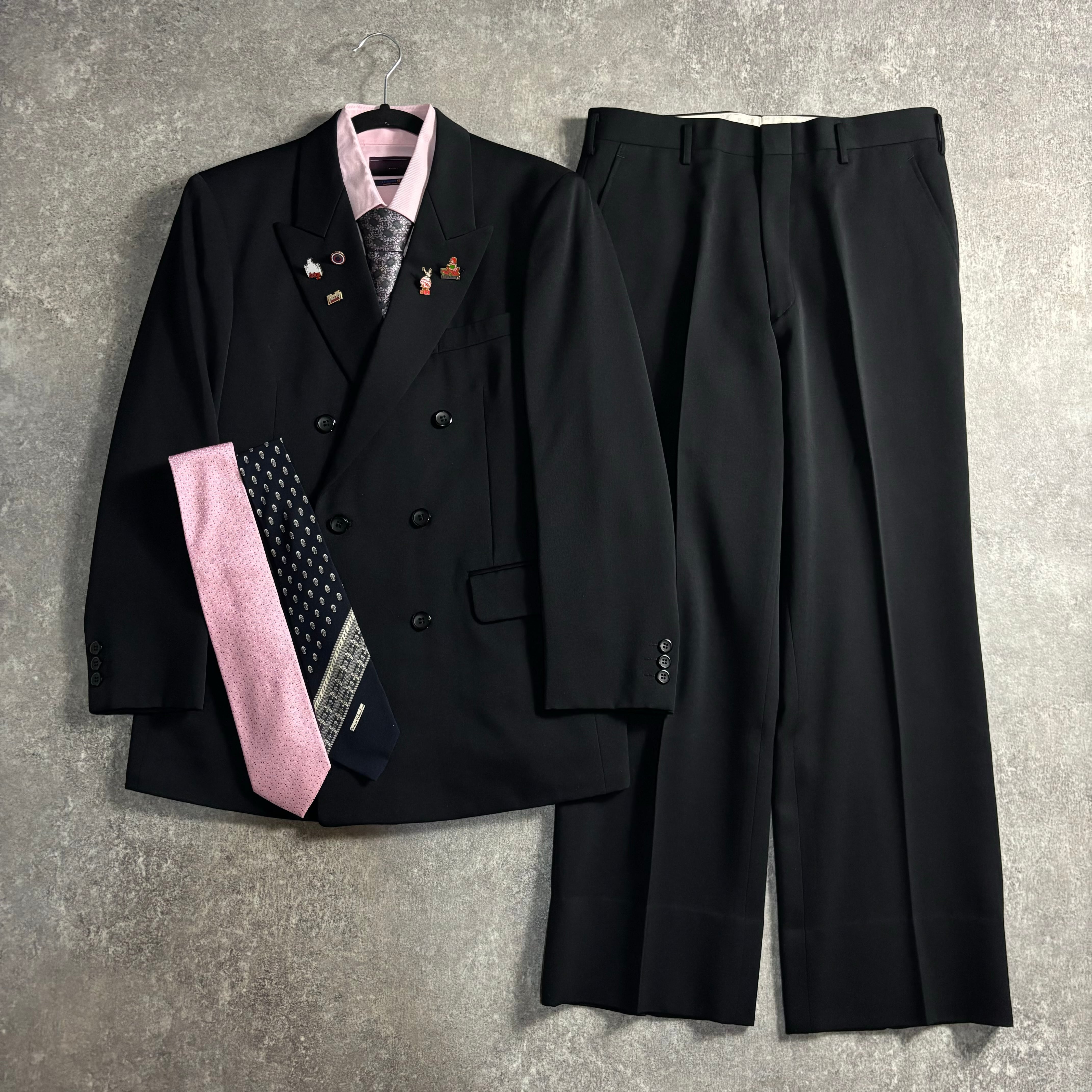 スーツ/ネクタイ/ヴィンテージピンズの3点フルセットでございます